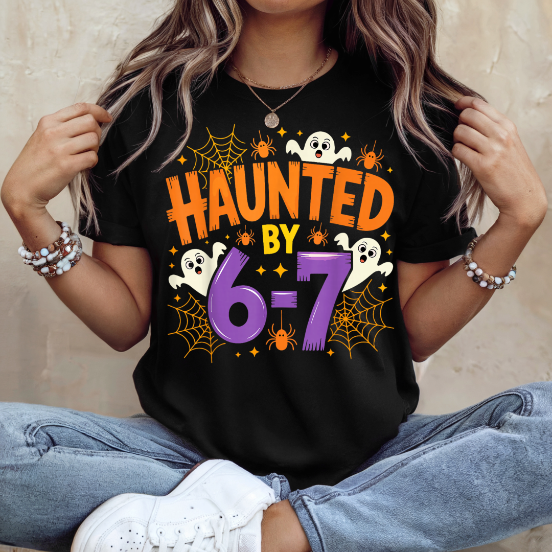 Get ready to rock the latest viral trend with the "Haunted By 6-7" Halloween T-Shirt! This design features the trending "6-7" phrase that kids are going wild for, making it a must-have for the season. The fun, spooky graphic is packed with friendly ghosts, curious spiders, and classic spiderweb motifs in vibrant orange and purple tones.
