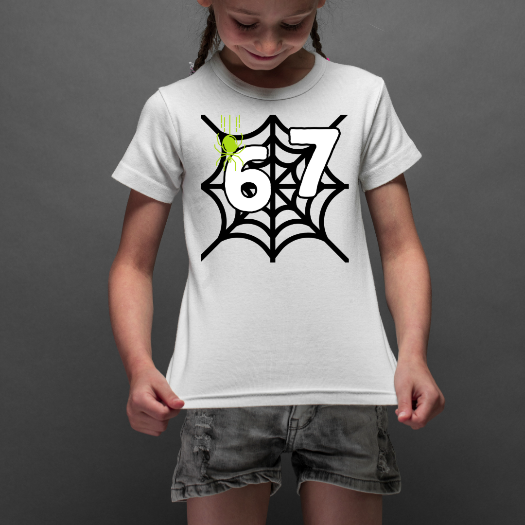 Catch the trend with the "The 6-7 Spiderweb" T-shirt! This fun and eye-catching design features the viral "6-7" numbers prominently displayed inside a spooky black spiderweb. A bright, neon green spider hangs from the top, adding a cool, electric contrast. This shirt is perfect for kids who love the trending phrase, want a unique Halloween look, or just enjoy a bold, graphic tee.