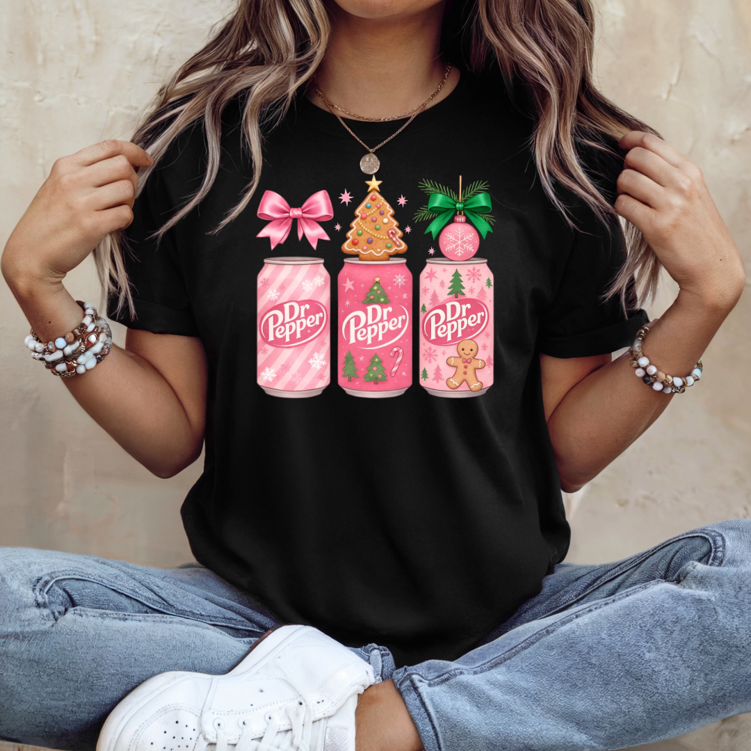 Celebrate your favorite soda and the holiday season with the festive Christmas Soda Can Obsession T-shirt! This fun and unique design features three pink soda cans, each playfully decorated with Christmas motifs like a pink bow, a gingerbread man, snowflakes, and tiny Christmas trees. A gingerbread man, a Christmas tree cake, and a sparkly pink ornament top the cans, making this tee a sweet and whimsical tribute to the holidays.